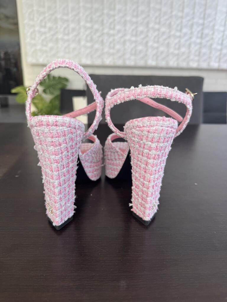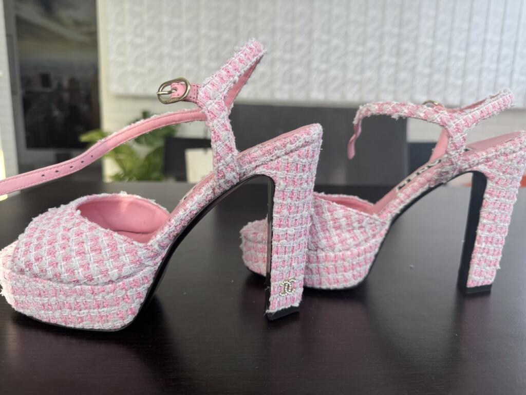 Aceasta pereche de sandale Chanel, confectionata dintr-un material textil extrem de pretentios, a fost curatata cu grija folosind solutii profesionale. Pentru un confort optim, sandalele au fost largite in laterale, utilizand presa speciala de ajustare. Rezultatul a fost impecabil, redand atat estetica, cat si functionalitatea pantofilor.
